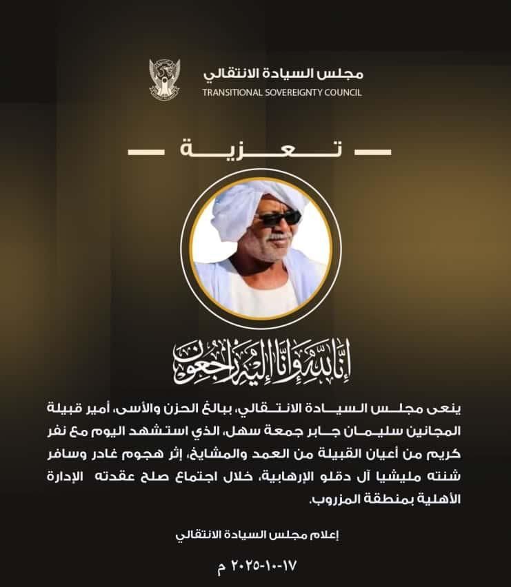 نعى مجلس السيادة الانتقالي، ببالغ الحزن والأسى، أمير قبيلة المجانين سليمان جابر جمعة سهل، الذي استشهد اليوم مع نفر كريم من أعيان القبيلة من العمد والمشايخ، إثر هجوم ارهابي خلال اجتماع صلح عقدته الإدارة الأهلية بمنطقة المزروب.