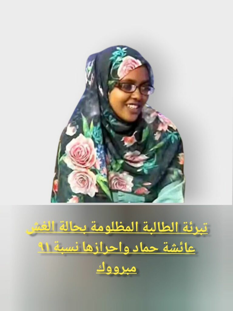 عائشة بريئة وفرخنا لفرحتها وتبرئتها من ظلم حالة الغش التي اتهمت بها كما وان نسبة نجاحها ليست بالقليلة تعتبر من الطلاب المتفوقين .